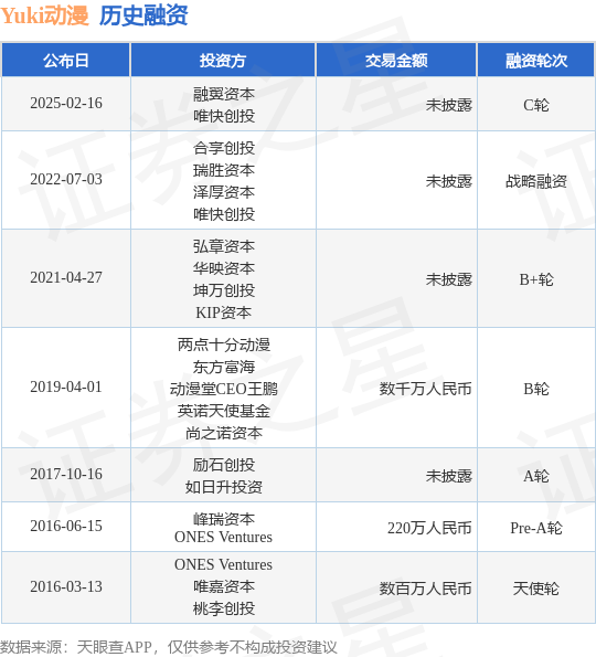 [投融资动态]Yuki动漫C轮融资, 投资方为融翼资本、唯快创投等
